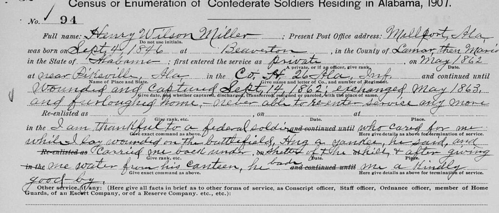 On this 1907 questionnaire, Henry W Miller, late Private in the 26th Alabama Infantry, related a small story of how he was cared for by a Federal soldier after he had been wounded at Turner’s Gap on 14 September 1862. He was then just 16 years old. He was sent home, disabled, after he was exchanged in May 1863.