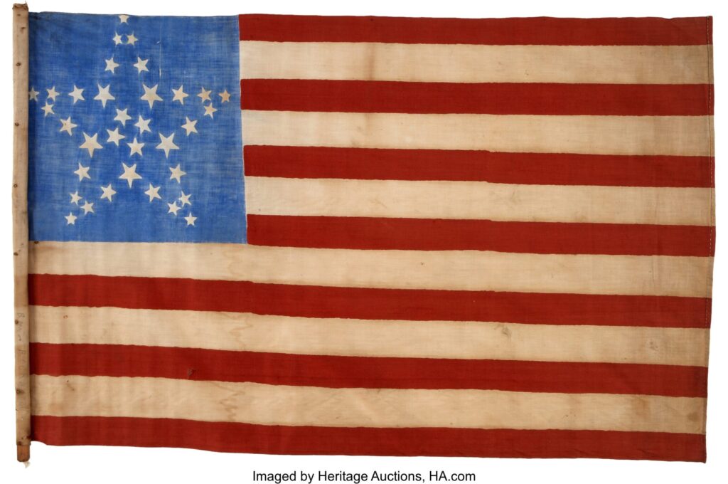 While probably most common, the rectangular 34-star arrangement above – similar to our modern 50-star pattern, but in rows of 6-5-6-6-5-6 – was not the only one used, as the Act specified only the number of stars. Also frequently seen are flags with rows of 7-7-6-7-7 stars and similar.