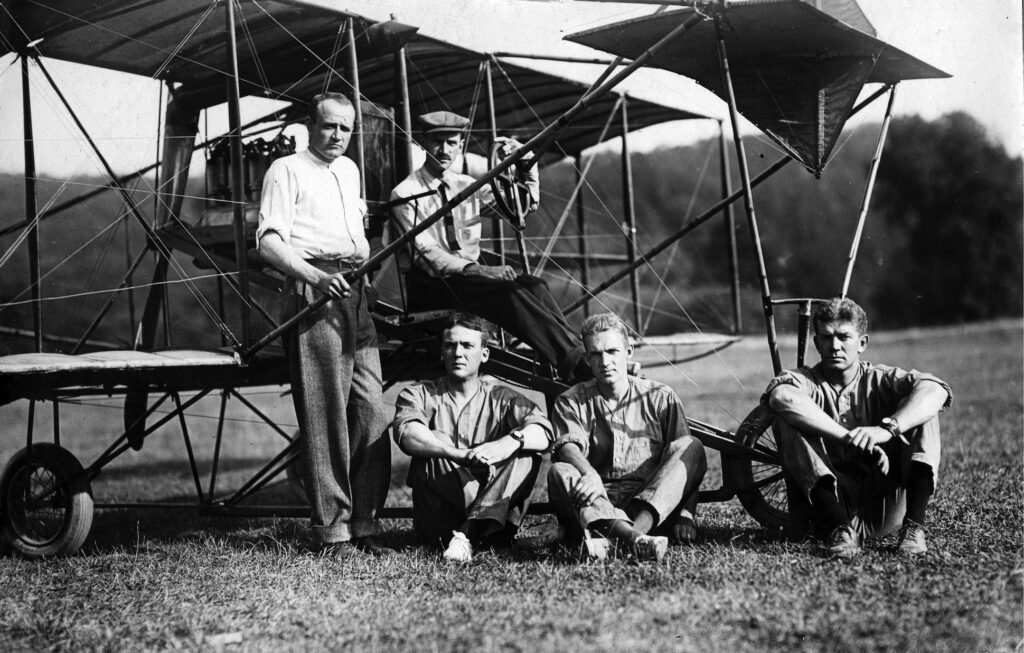 Pictured is the Curtiss A-1 aircraft with Glenn H Curtiss at the wheel. Seated (L-R) are his students – young US Navy officers John Rodgers, John Henry Towers, and Theodore Ellyson – who qualified that summer as Naval Aviators #2, #3 and #1, respectively. The man standing at left is not identified, but is possibly Eugene Burton Ely (1879-1911), Curtiss’ pilot and a pioneer of Naval Aviation in his own right – the first man to take off from and land on a ship.